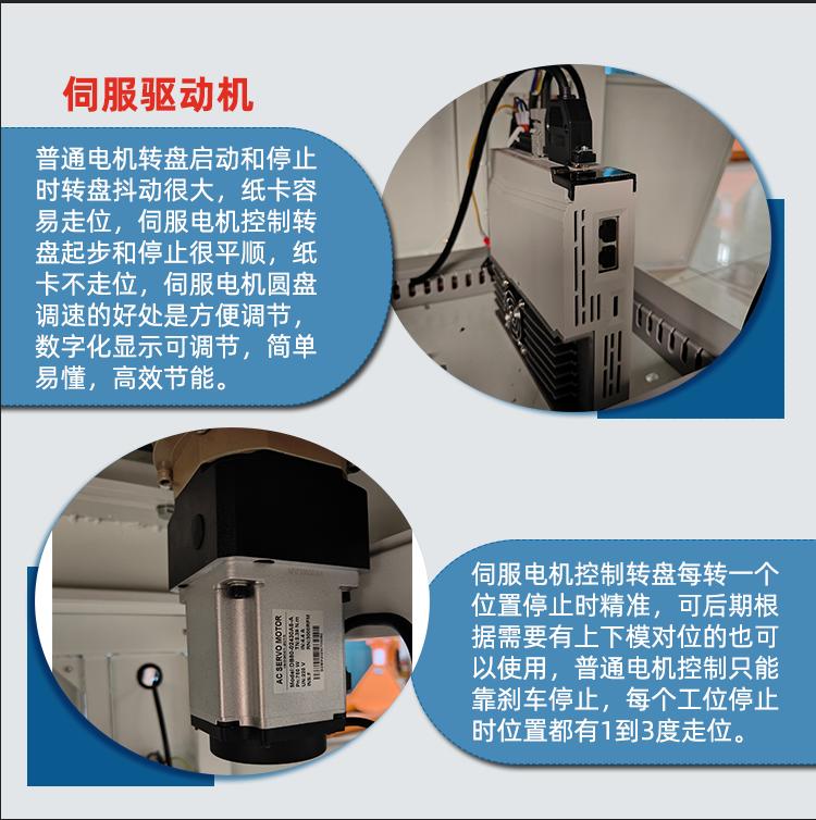 ②伺服電機控制轉(zhuǎn)盤,模具邊上可以放一疊紙卡,方便工人能快速放進模具,大大提高生產(chǎn)效率。普通電機控制的轉(zhuǎn)盤,模具邊如果放紙卡就會把紙卡沖走轉(zhuǎn)位。
